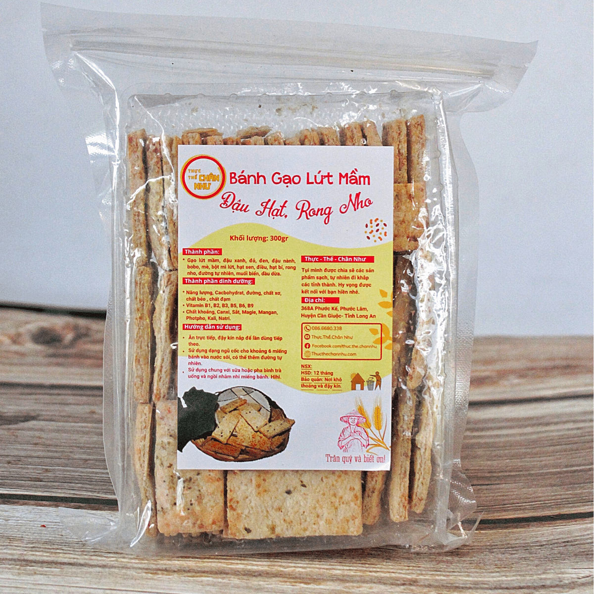 ● Thành phần: Gạo lứt mầm, rong nho, đậu xanh, đậu đỏ, đậu nành, bobo, mè, bột mì lứt, hạt sen, điều, hạt bí, đường tự nhiên, muối biển, dầu dừa.