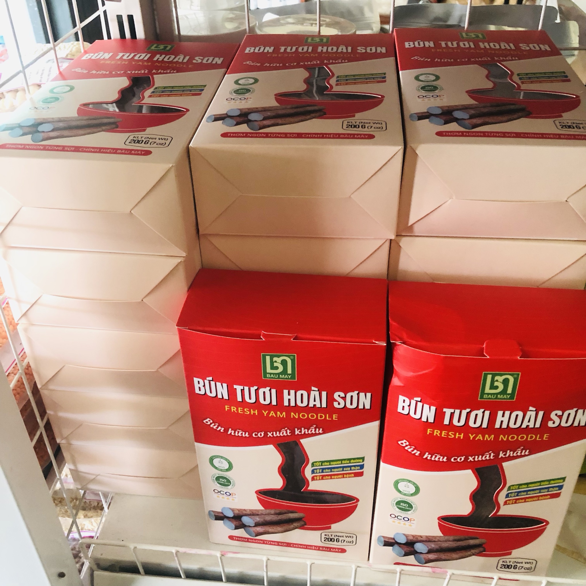 Bún Hoài sơn gạo hữu cơ được sản xuất từ 100% nguyên liệu trồng tại vùng nguyên liệu Bầu Mây theo tiêu chuẩn hữu cơ, đảm bảo tiêu chí “Không phụ gia, Không chất bảo quản, Không phẩm màu”.